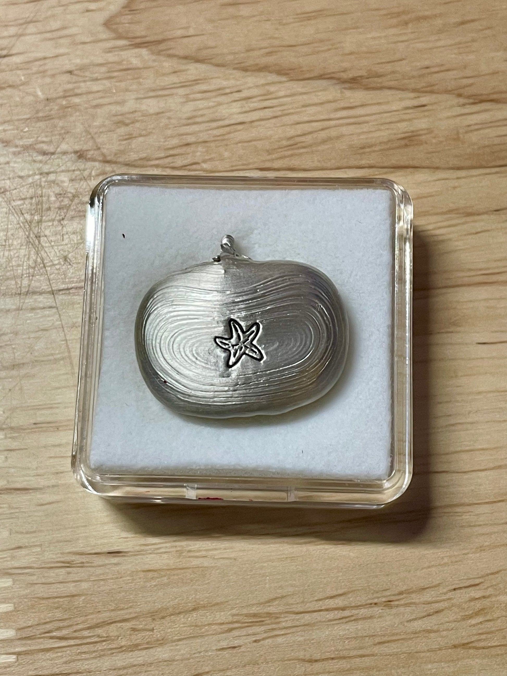 A custom silver treat only found here. Only 4 made with the splattered paint. Hand poured in .999 silver with a custom finish. Our signature ripples and Starfish stamp on the back. Ships in a plastic case with Certificate of Authenticity.